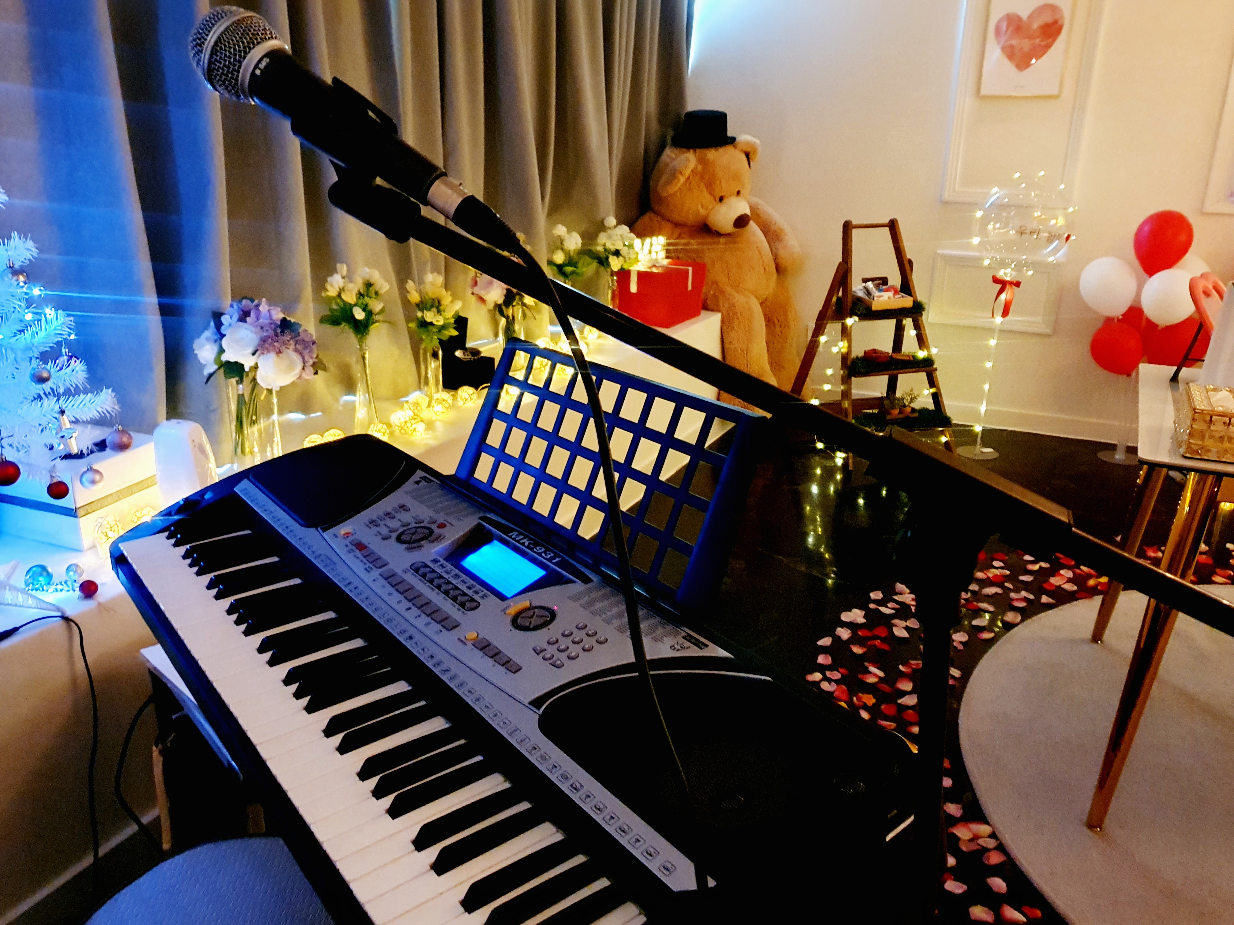 노래 프로포즈 가능. 대형 앰프와 스탠드 마이크, 건반, 통기타 까지 준비되어 있기 때문에 준비한 노래를 불러줄 수가 있어요. 원하시는 반주를 말씀해주시면 세상 가장 멋진 세레나데를 부르실 수 있도록 준비해 드립니다.